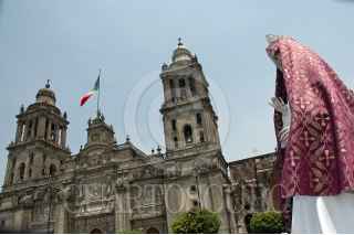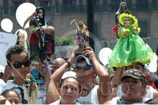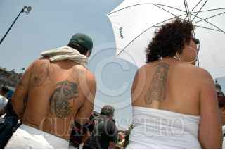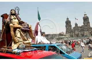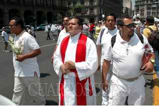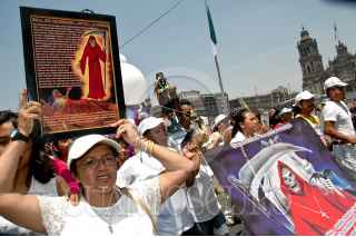 MÉXICO, D.F., 05ABRIL2009.- Dos creyentes de la "niña blanca se manifiestan junto a cientos de seguidores de la Santa Muerte alrededor del Zócalo Capitalino gritando consignas en contra del cardenal Norberto Rivera como protesta contra los ataques de la Iglesia católica, que la acusa de ser una secta y estar vinculada con narcotraficantes. FOTO: RODOLFO ANGULO/CUARTOSCURO.COM