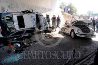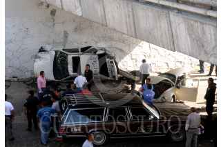 MÉXICO, D.F., 05ABRIL2009.- Un sujeto perdió la vida abordo de su auto VW blanco con placas de circulación 602-UFR al caerle encima otro auto tipo Jetta de seguridad privada con número económico AESSA2, el cuál circulaba con exceso de velocidad sobre el puente de periférico a la altura de la calle constelación, de la colonia jardines de la Hacienda en cuautitlan Izcalli. FOTO: LUIS CARBAYO/CUARTOSCURO.COM