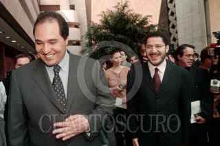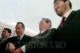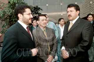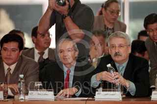 Los diputados Oscar Levín Coppel, presidente de la Comisión de Hacienda y Luis Pazos, presidente de la Comisión de Presupuesto, escuchan el documento que dio lectura el gobernador de Chihuahua, Patricio Martínez, en el cual los mandatarios estatales integrantes de la Conago proponen el monto de la Recaudación Federal Participable y, para 2003, pasar del 20 al 24% que se asigna al fondo general de participaciones, entre otros puntos. FOTO: Oswaldo Ramírez/CUARTOSCURO.COM