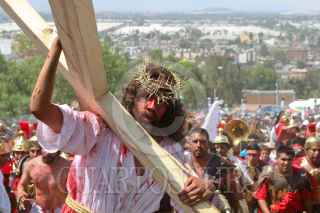 MÉXICO, D.F., 10ABRIL2009.- Jesús de Nazareth, interpretado por Diego Zirahuen Villagrán, es crucificado al termino de la tradicional representación del viacrucis de La Pasión en Iztapalapa. FOTO: RICARDO CASTELAN/CUARTOSCURO.COM