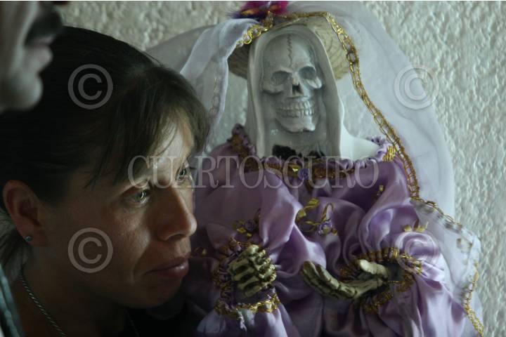 MÉXICO, D.F., 12ABRIL2009.- Una imagen de la Santa Muerte es llevada por un grupo de personas en una procesión desde el barrio de Tepito hasta las inmediaciones de la Basilica de Guadalupe en donde se manifestaron y gritaron consignas en contra del cardenal Norberto Rivera como protesta contra los ataques de la Iglesia católica, que la acusa de ser una secta y estar vinculada con narcotraficantes y para que se les permita profesar libremente su fe. FOTO: RODOLFO ANGULO/CUARTOSCURO.COM