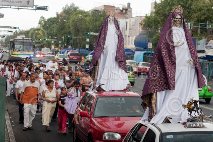 MÉXICO, D.F., 12ABRIL2009.- Una imagen de la Santa Muerte es llevada por un grupo de personas en una procesión desde el barrio de Tepito hasta las inmediaciones de la Basilica de Guadalupe en donde se manifestaron y gritaron consignas en contra del cardenal Norberto Rivera como protesta contra los ataques de la Iglesia católica, que la acusa de ser una secta y estar vinculada con narcotraficantes y para que se les permita profesar libremente su fe. FOTO: RODOLFO ANGULO/CUARTOSCURO.COM