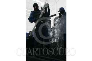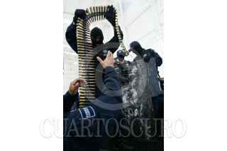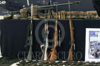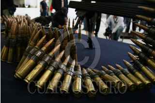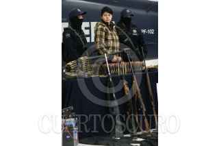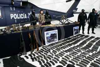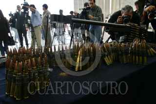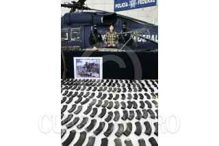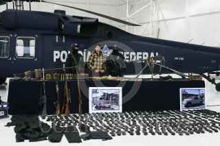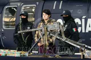 MÉXICO, D.F., 14ABRIL2009.- La Policía Federal presentó en sus instalaciones a Anahí Beltrán Cabrera, de 20 años de edad, quien fue capturada en el municipio de Santa Ana, Sonora, en posesión de un arsenal consistente en una ametralladora marca Browning, calibre 50 milímetros, con capacidad de fuego de 800 disparos por minuto y el suficiente poder para penetrar cualquier tipo de blindaje, además de cinco fusiles, un lanzagranadas, una granada de mano, 261 cargadores, 29 cajas de cartuchos útiles, cuatro cintas metálicas para cartuchos y 750 de gramos de cocaína. La casa donde se aseguró el armamento se encuentra sobre la calle Niños Héroes y avenida Abasolo, colonia Fátima de Santa Ana. FOTO: ISAAC ESQUIVEL/CUARTOSCURO.COM