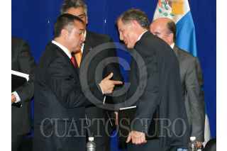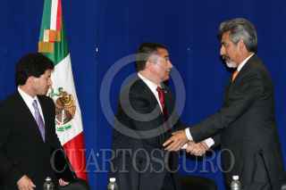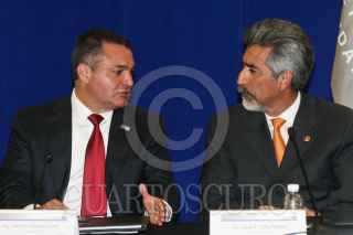 MÉXICO, D.F., 14ABRIL2009.- Genaro García Luna, secretario de Seguridad Pública federal, y Juan Manuel Durán Gutiérrez, rector de la Zona Metropolitana de la Ciudad de México del Tec de Monterrey, durante la conferencia donde anunció la cooperación entre la SSP federal y varias institutiones de educación universitaria. FOTO: ISAAC ESQUIVEL/CUARTOSCURO.COM