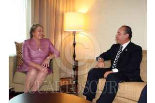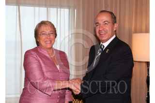 PUERTO ESPAÑA, TRINIDAD Y TOBAGO., 19 ABRIL2009.- La presidenta de Chile Michelle Bachelet y Felipe Calderon Hinojosa presidente de México en se reunieron en el marco de la quinta Cumbre de las Americas. FOTO ARIEL GUTIERREZ/CUARTOSCURO.COM