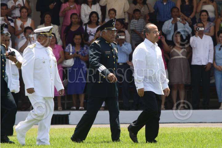 VERACRUZ, VERACRUZ 21 ABRIL2009.- Felipe Calderón Hinojosa presidente de México acompañado por el Secretario de Marina Francisco Saynez Mendoza y el Secretario de la Defensa Nacional Guillermo Galvan Galvan encabezo la Ceremonia Conmemorativa del XCV Aniversario de la Defensa del Puerto de Veracruz y Jura de Bandera de los Cadetes del Primer Año de la Heroica Escuela Naval Militar FOTO: SASHENKA GUTIÉRREZ/CUARTOSCURO.COM