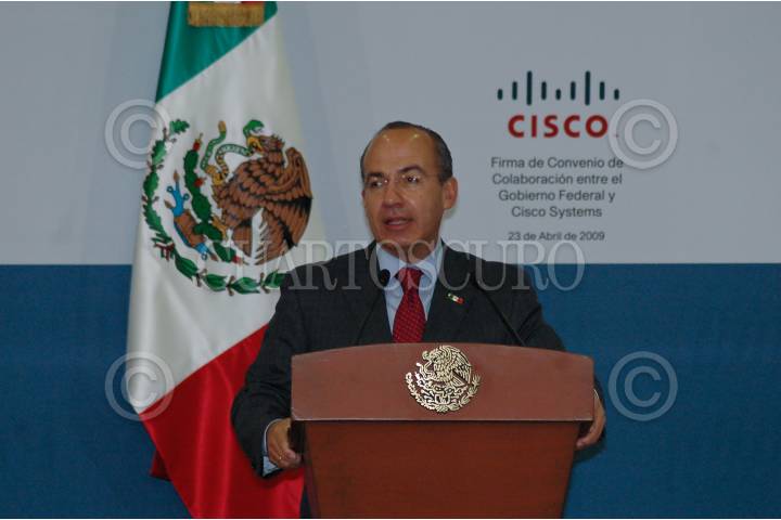 MÉXICO, D.F., 23ABRIL2009.- El presidente Felipe Calderón durante su participación en el evento de la firma de convenio de colaboración entre el Gobierno Federal y Cisco Systems que se celebro en el salón Adolfo López Mateos de la residencia oficial de Los Pinos. FOTO: RODOLFO ANGULO/CUARTOSCURO.COM