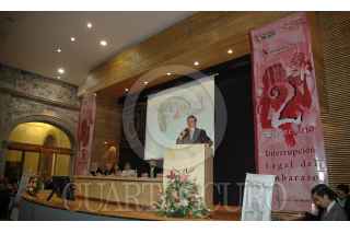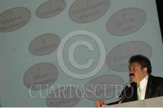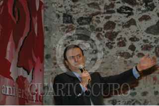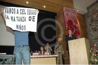 MÉXICO, D.F., 23ABRIL2009.- Un joven protesta con una manta durante la participación de Marcelo Ebrard, jefe de gobierno del D.F., durante la ceremonia conmemorativa del 2° Aniversario de la Ley de Interrupción Legal del Embarazo que se realizo en la antigua escuela de medicina. FOTO: RODOLFO ANGULO/CUARTOSCURO.COM