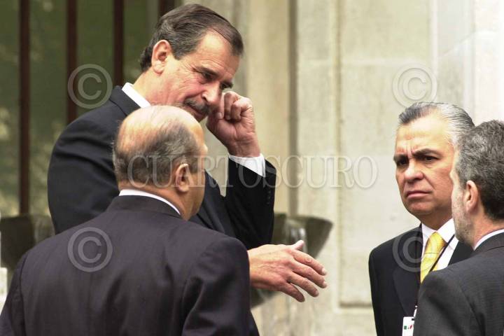El presidente Vicente Fox, Reyes Tamez, secretario de educación, Rafael Macedo de la Concha, procurador general de la República y el secretario de Gobernacion, Santiago Creel, al término de la foto oficial de la Binacional México - USA que se realizó esta mañana en la residencia oficial de Los Pinos. FOTO: Oswaldo Ramirez/CUARTOSCURO.COM