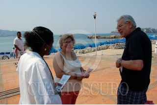 ACAPULCO, GUERRERO, 28ABRIL2009.- Empleados de la Secretaria de Salud municipal reparten volantes a turistas en las playas de Acapulco para tomar medidas preventivas por la Influencia porcina registrada en otros estados del país. FOTO: MARINO D. VALDEZ/CUARTOSCURO.COM