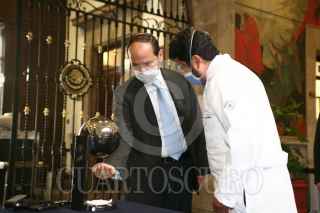 MÉXICO, D.F., 28ABRIL2009.- Gustavo Madero, Presidente de la Mesa Directiva del Senado, se lava las manos en el cerco sanitario establecido en la entrada del Senado de la República. FOTO:CUARTOSCURO.COM