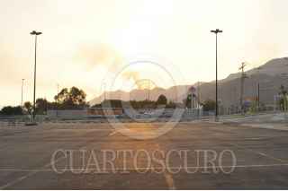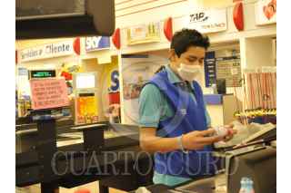CHAPALA, JALISCO, 29ABRIL2009.- Las grandes cadenas de distribución empezaron a sufrir el paro de las actividades, debido al virus de la influenza porcina que esta amenazando a lo largo y lo ancho el País en estos días. Se ve poca gente en la calle y ninguna cola en las cajas. A los niños que ayudan a empacar el mandado no tuvieron opción mas que mirar el atardecer, con el cubrebocas. FOTO: MARIA DI PAOLA BLUM/CUARTOSCURO.COM