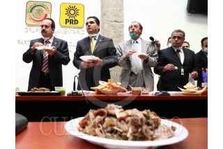 MÉXICO, D.F., 29ABRIL2009.- Silvano Aureoles Conejo, vicecoordinador de los Senadores del PRD y su compañero de bancada, Antonio Mejía Haro, comieron carnitas y chicharrón en apoyo a los productores porcícolas que han sido impactados severamente a raíz de la definición errónea de influenza porcina, para demostrar que la carne de cerdo no es causa de contagio de dicha enfermedad. FOTO: CUARTOSCURO.COM