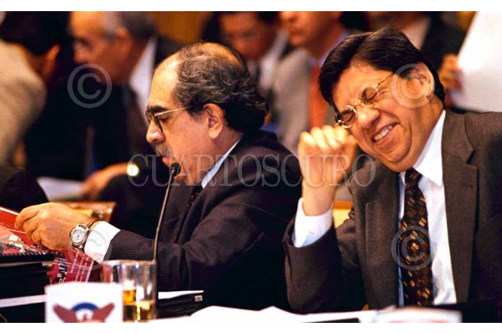 Pablo Gómez representante del PRD ante el IFE y Juan Miguel Castro Rendón, representante del Partido Convergencia por la Democracia, durante la sesión de esta mañana en dicho instituto. FOTO: Pedro Mera/CUARTOSCURO.COM
