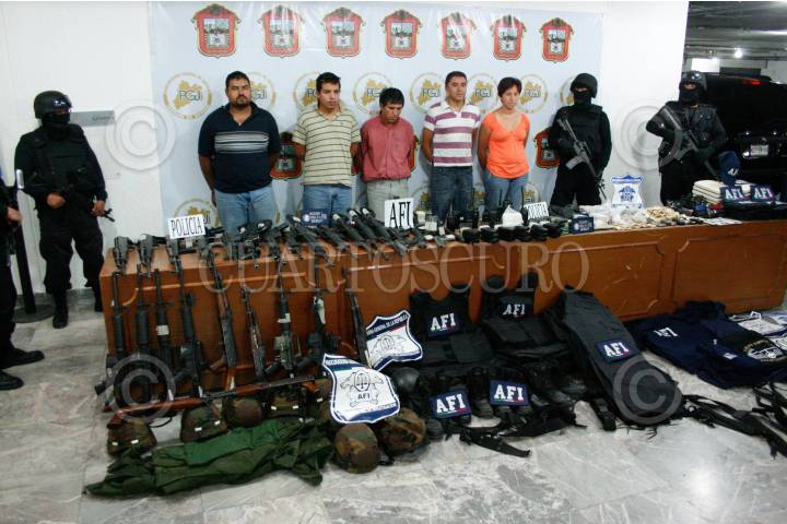 TOLUCA. EDO. DE MÉXICO, 30ABRIL2009.- Detenida peligrosa Banda delictiva denominada "Banda del Toro" que operaba en el Valle de Toluca, Jorge Pérez Farfán, de 28 años, alías “El Toro”, presunto líder de esta organización delictiva, originario de Zitácuaro Michoacán, el cual se encontraba a bordo de una camioneta Windstar color blanca, a quien se le aseguró en sus manos un paquete de cocaína, Michel Paniagua Tolteca, de 28 años, esposa de Pérez Farfán, Neftali Paniagua Tolteca, de 32 años, alías “el flaco”, hermano de Michel, cuya actividad dentro de la organización, era alimentar a las víctimas que se encontraban privadas de su libertad, Prisciliano Sánchez Sánchez, de 43 años, alias “el Prisi”, sujeto que se dedicaba a la compra y venta de droga. Elementos de seguridad exploraron una casa de seguridad asegurando dentro del inmueble: 13 armas largas, 4 armas cortas, 18 cargadores para fusil AK47, 155 cartuchos calibre, 38 super, 11 chalecos antibalas con la leyenda AFI, Ropa de comando de color verde militar, etc. FOTO: CUARTOSCURO.COM