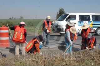 TEQUIXQUICAC, EDO. DE MÉXICO, 30ABRIL2009.- Trabajadoras del ayuntamiento local trealizan labores de limpieza sobre la carretera con cubrebocas para protegerse del virus de la influenza. FOTO: MARIO NULO/CUARTOSCURO.COM