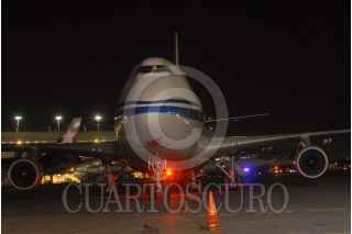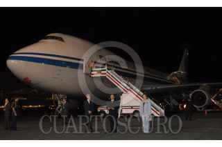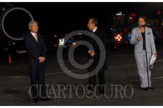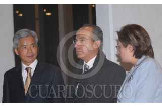 MÉXICO, D.F., 01MAYO2009.- Yin Hengmin, embajador de China en México; Felipe Calderón Hinojosa, presidente de México y Patricia Espinosa, secretaría de Relaciones Exteriores, la noche de ayer recibieron en el hangar presidencial el apoyo del gobierno chino que envió a México para enfrentar la emergencia sanitaria del virus de la influenza humana. La donación fue de cinco millones de dólares, un millón en efectivo y cuatro en insumos. FOTO: ALBERTO VERA/CUARTOSCURO.COM