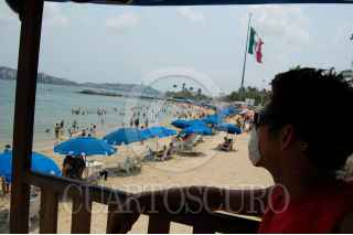 ACAPULCO, GUERRERO, 01MAYO2009.- Un hombre destinado para salvar vidas, en las playas de Acapulco, observa cientos de Turistas nacionales y extranjeros divirtiéndose en familia pese a virus de la Influenza Humana, registrada en otros lugares del país. FOTO: MARINO D. VALDEZ/CUARTOSCURO.COM