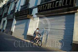 MÉXICO, D.F., 01MAYO2009.- Un niño pasa en bicicleta por uno de los cientos de restaurantes cerrados en la capital, muchos de estos establecimientos han suspendido actividades como medida para evitar el contagio ante el brote epidemiológico de influenza, algunos restaurantes continúan abiertos ofreciendo comida exclusivamente para llevar. Estas acciones fueron ordenadas por el gobierno del Distrito Federal como medida para evitar la propagación del virus de la influenza humana AH1N1. FOTO: RODOLFO ANGULO/CUARTOSCURO.COM