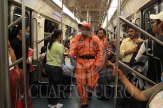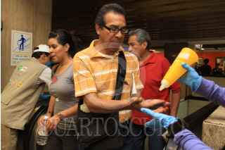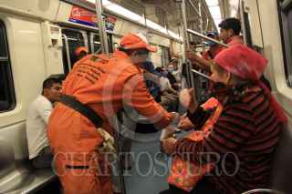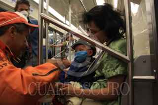 MÉXICO D.F., 02 MAYO2009.- Como parte del plan de control sanitario que operará en el Metro, con 10 acciones, la cuales incluyen la limpieza profunda en puntos de contacto como en torniquetes, pasamanos, escaleras, taquillas, locales técnicos, vagones, andenes y pasillos, de igual manera personal de protección civil reparte a los usuarios desinfectante para las manos FOTO: SÁSHENKA GUTIÉRREZ/CUARTOSCURO.COM