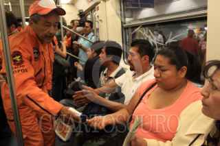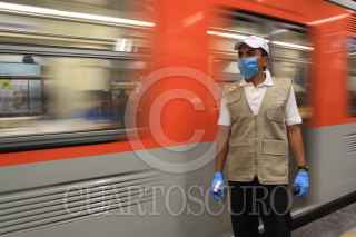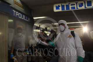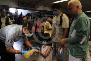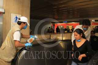 MÉXICO D.F., 02 MAYO2009.- Como parte del plan de control sanitario que operará en el Metro, con 10 acciones, la cuales incluyen la limpieza profunda en puntos de contacto como en torniquetes, pasamanos, escaleras, taquillas, locales técnicos, vagones, andenes y pasillos, de igual manera personal de protección civil reparte a los usuarios desinfectante para las manos FOTO: SÁSHENKA GUTIÉRREZ/CUARTOSCURO.COM