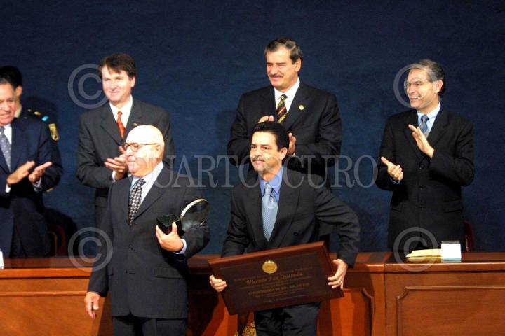 Vicente Fox Quesada, presidente de México, junto con Luis Ernesto Derbez, secretario de Economia, entregaron el Premio Nacional de Exportación 2002, en la residencia oficial de Los Pinos. FOTO: Antonio García/CUARTOSCURO.COM