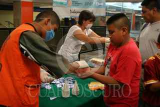 MÉXICO, D.F., 03MAYO2009.- personas que viajan en el Sistema de Trasporte Metro son desinfectadas con gel anti vactereal para evitar el contagio por el virus de la influenza humana FOTO: RICARDO CASTELAN/CUARTOSCURO.COM