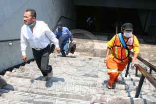 MÉXICO, D.F., 04MAYO2009.- Brigadas de limpieza del Distrito Federal limpian y desinfectan las entradas del Metro, esto como una medida más para evitar el contagio por el virus de la influenza humana. FOTO: RICARDO CASTELAN/CUARTOSCURO.COM