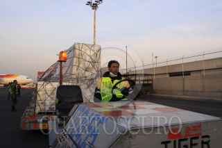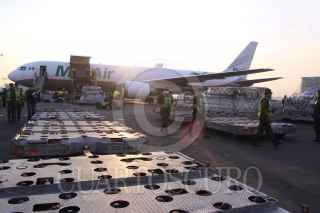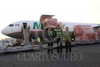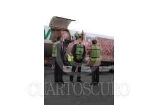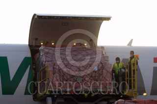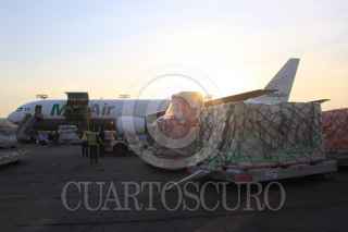 MÉXICO D.F., 05 MAYO2009.- El Embajador de Corea en México, Jong Chan Won recibió esta mañana un avion prosedente de Corea que contiene ayuda médica en la que consiste cubrebocas, juego de ropa de aislamiento, trajes para exposición desechables, fundas para calzado, etc, que será repartida en diversos estados de la república Mexicana FOTO: SÁSHENKA GUTIÉRREZ/CUARTOSCURO.COM