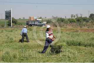 TEQUIXQUIAC, EDO. DE MÉXICO, 06MAYO2009.- En esta temporada de calor se da la cosecha del pasto lechero destinado para las vacas de establo que dan leche. El hijo del señor Alberto Miguel recoge el producto de varios meses de esfuerzo para venderlo en los ranchos de la región. FOTO: MARIO NULO/CUARTOSCURO.COM