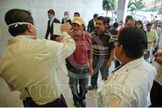 MÉXICO, .D.F,. 06MAYO2009.- Elementos de seguridad pública del D.F., ofrecen cubre bocas a las personas antes de ingresar al Tribunal de Justicia del Distrito Federal en donde también son revisados por una cámara termografica para detectar personas con temperatura por arriba de 38 grados para evitar posibles contagios por el virus de la influenza A-H1N1. FOTO: RODOLFO ANGULO/CUARTOSCURO.COM