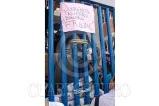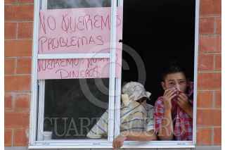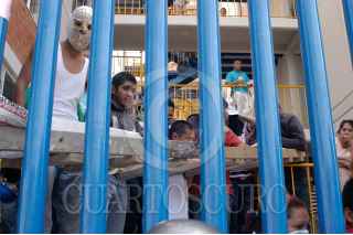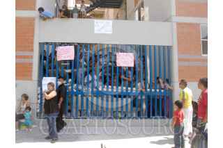 MÉXICO, D.F., 06MAYO2009.- Vecinos del Barrio Bravo de Tepito, invadieron una unidad habitacional, que se acaba de construir en Avenida del Trabajo esquina con la calle Gorostiza, en el barrio de Tepito, perimetro de la delegación Cuauhtemoc. Éstos reclaman que fueron defraudados por personal del Istituto Nacional de Vivienda (INVI), quienes aseguran les fueron vendidos los departamentos. Dichas personas se atrincheran en estas viviendas con cadenas y costales al interios de las entradas. FOTO: LUIS CARBAYO/CUARTOSCURO.COM