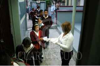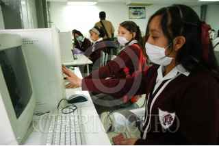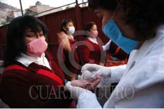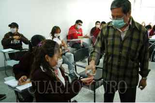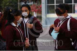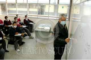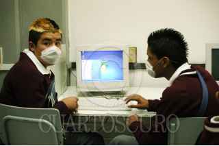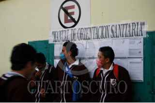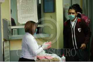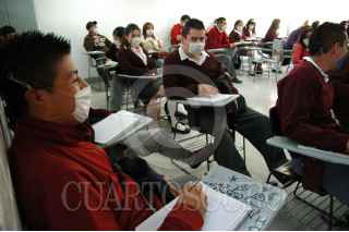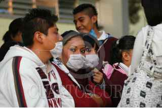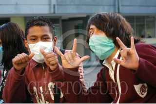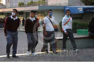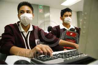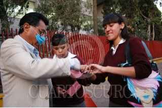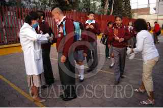 MÉXICO D.F., 07MAYO2009.- Al regresar a clases, después de varios días de contingencia para evitar el contagio y la propagación del virus de la Influenza Humana (AH1N1) los estudiantes de nivel bachillerato del CETIS No. 55, ubicado en la delegación Gustavo A. Madero, en la entrada les son entregados cubrebocas, se desinfectan las manos con gel y son cuestionados por médicos quienes son apoyados del personal del plantel y padres de familia, para detectar a quien presenten los síntomas de la gripe y ser mandado a una revisión medican más minuciosa, esto como una medida de prevención de contagio. FOTO: GUILLERMO PEREA/CUARTOSCURO.COM