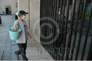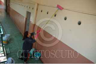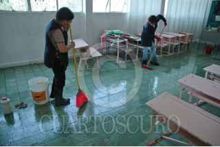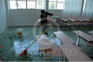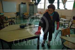 MÉXICO, D.F., 07MAYO2009.- Personal de limpieza de las escuelas primarias de la ciudad hacen limpieza y desinfectan los salones, pupitres y demás instalaciones como medida preventiva para evitar la propagación del virus de la influenza humana AH1N1 en los niños que el próximo lunes regresarán a clases. FOTO: RODOLFO ANGULO/CUARTOSCURO.COM