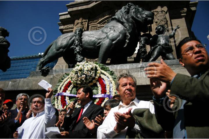 MÉXICO D.F., 08MAYO2009.- Porfirio Muñoz Ledo, cadidato a diputado, acompañado de Jaime Cárdenas, ex consejero del IFE, Mario Diconstanzo, Secretario de Hacienda del Gobierno Legitimo y Gerardo Fernández Noroña, candidato a diputado por el PT, así como militantes del Partido del Trabajo (PT), encabezo una ceremonia por el Natalicio de Don Miguel Hidalgo y Costilla, que se realizo al pie del Monumento del Ángel de la Independencia. FOTO: GUILLERMO PEREA/CUARTOSCURO.COM
