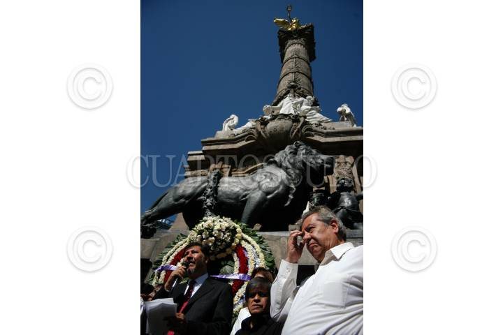 MÉXICO D.F., 08MAYO2009.- Porfirio Muñoz Ledo, cadidato a diputado, acompañado de Jaime Cárdenas, ex consejero del IFE, Mario Diconstanzo, Secretario de Hacienda del Gobierno Legitimo y Gerardo Fernández Noroña, candidato a diputado por el PT, así como militantes del Partido del Trabajo (PT), encabezo una ceremonia por el Natalicio de Don Miguel Hidalgo y Costilla, que se realizo al pie del Monumento del Ángel de la Independencia. FOTO: GUILLERMO PEREA/CUARTOSCURO.COM