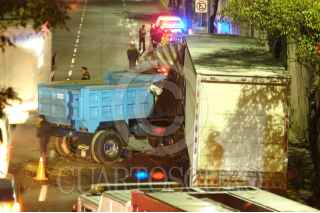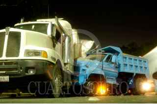 MÉXICO D.F., 09MAYO2009.- Ayer por la noche un camión de volteo se impacto contra la caja de un trailer después de estrellarse en una camioneta Toyota por la parte trasera de este camión, todo esto originando que perdiera el control los hechos se registraron en Avenida Constituyentes casi esquina con Avenida Observatorio perímetro de la Delegación Miguel Hidalgo. FOTO: LUIS CARBAYO/CUARTOSCURO.COM