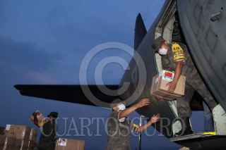 MÉXICO, D.F., 09MAYO2009.- El pasado 5 y 6 de Mayo elementos del ejercito Mexicano, y de la Fuerza Aérea, cargaron aviones Hércules C 130 con aproximadamente 1.5 toneladas con insumos sanitarios para el tratamiento del virus de la influenza humana, los materiales han sido donados por países como China, España, Francia y Corea del sur, el avión realizó una ruta de seis bases aéreas las cuáles fueron: Pie de la Cuesta en Acapulco, Guerrero, Oaxaca, Tuxtla Gutiérrez, Chiapas, Cancún, Quintana Roo, Villahermosa, Tabasco, y Veracruz La donación de medicamentos están conformados por cubrebocas de alta protección, tapabocas de tela, lentes protectores, trajes de protección desechables, fundas para zapatos, guantes de látex, algodón esterilizado, líquido para lavar manos, gel antibacterial y equipos termodetectores los cuáles seran destinados a instituciones de salud y a la población. FOTO: SÁSHENKA GUTIERREZ/CUARTOSCURO.COM
