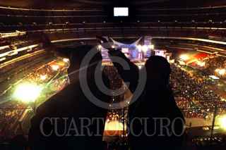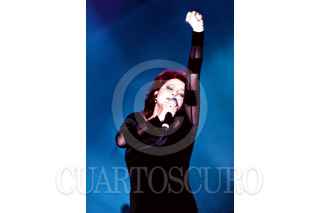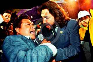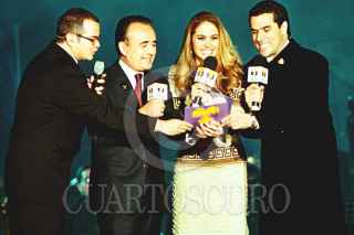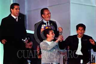 Los conductores del Teletón, Pedro Ferriz, Lucero y Marco Antonio Regil, festejan junto con Aleks Sintec los 217 millones, 876 mil, 247 pesos recaudados este año; el Teletón 2002 consiguió rebasar los 207 millones 408 mil 620 pesos, reunidos el año pasado. FOTO: Juan Pablo Zamora/CUARTOSCURO.COM
