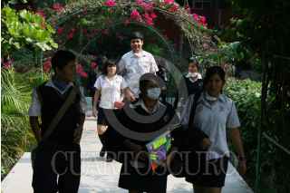 CHILPANCINGO, GUERRERO, 11MAYO2009.- Estudiantes de nivel medio superior y superior retornaron este lunes a clases luego de que se alargara la suspensión de estas por decisión de las autoridades de salud y de educación en la entidad debido a la alerta emitida para evitar posibles casos de contagio del virus de la influenza humana, y siguiendo las recomendaciones emitidas por las autoridades de la Secretaria de Salud Federal de poner filtros donde se reciben a los alumnos para ver si no presentan algun sintoma de gripe o temperatura. La imagen en el CBTis 134, donde solo algunos alumnos portaban cubre bocas, caso contrario al personal docente y administrativo asi como las personas que atienden la cafetería de dicha institución. FOTO: OSCAR ALVARADO/CUARTOSCURO.COM
