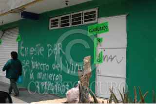 NEZAHUALCÓYOLT, EDO. DE MÉXICO, 13MAYO2009.- Este local fue clausurado por el gobierno local por incurrir en varias iregularidades, aprovechando el virus de la influenza humana, alguna persona pintó consignas para que salgan los bares de la localidad y atribuye la clausura del bar "Cocos" porque se infectaron dos personas que supuestamente murieron. El lugar se encuentra ubucado sobre avenida Chimalhuacán, a unas cuadras del Palacio Municipal. FOTO: MARIO NULO/CUARTOSCURO.COM