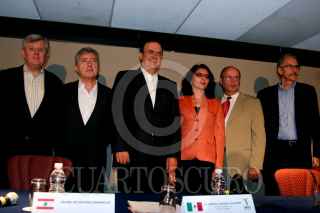 MÉXICO, D.F., 14MAYO2009.- El embajador representante de la organización de Estados Americanos, Oscar Maurtua, Nouhad Mahmoud, embajador de la República de Líbano, Marcelo Ebrad Casaubon jefe de gobierno del Distrito Federal, Gioconda Ubeda embajadora de Costa Rica, Guillermo Rishchynski embajador de Canadá y Carmelo Angu y embajador de España, durante una reunión que sostubieron para realizar un festival de naciones amigas en México para rescatar la economia turistica del pais. FOTO: RICARDO CASTELAN/CUARTOSCURO.COM