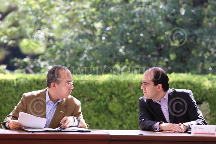 MÉXICO, D.F., 16MAYO2009.- Felipe Calderón Hinojosa, Presidente de México, durante la ceremonia "Contribución de México a la Organización Mundial de la Salud para la Producción de la Vacuna del Virus A H1N1, en la explanada del monumento a Francisco I. Madero en Los Pinos. FOTO: MOISÉS PABLO/CUARTOSCURO.COM