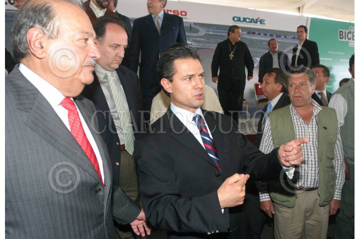 CIUDAD NEZAHUALCOYOTL, ESTADO DE MÉXICO., 21MAYO2009.- Carlos Slim Helú, fundador del grupo Carso, y el gobernador del estado, Enrique Peña Nieto, durante se reteiran en una camioneta despues de la inauguracion de la ciudad deportiva del proyecto Ciudad Jardin Bicentenario. FOTO: SAÚL LÓPEZ/CUARTOSCURO.COM