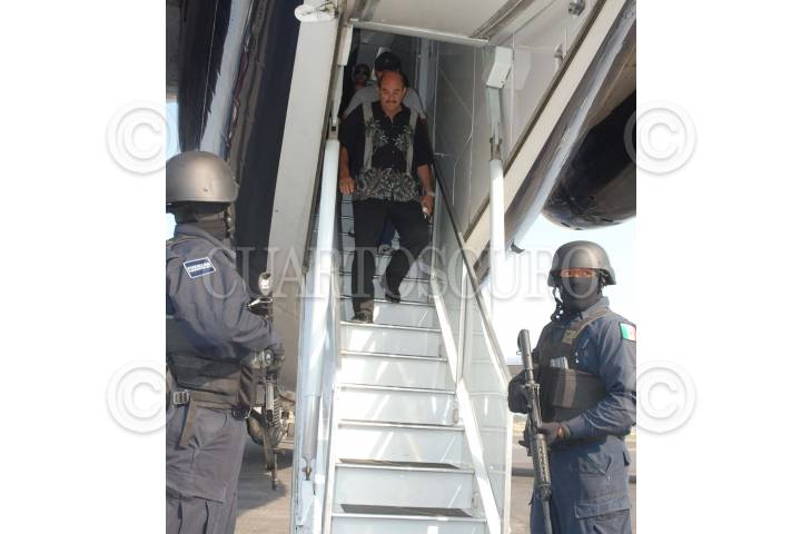 MORELIA MICHOACAN., 26MAYO2009.- Elementos de la Policia Federal, PGR y SEDENA, detuvieron a 27 servidores y ex servidores publicos, alcaldes, policías municipales y estatales de Michoacán que fueron detenidos en un fuerte operativo realizado en diversos municipios de Michoacan. En la imagen se muestra el traslado en el aeropuerto de dicha entidad. FOTO: SSPF/CUARTOSCURO.COM