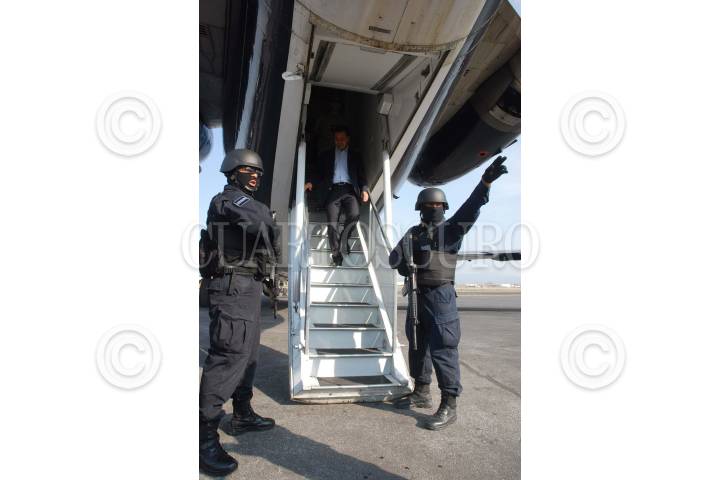 MORELIA MICHOACAN., 26MAYO2009.- Elementos de la Policia Federal, PGR y SEDENA, detuvieron a 27 servidores y ex servidores publicos, alcaldes, policías municipales y estatales de Michoacán que fueron detenidos en un fuerte operativo realizado en diversos municipios de Michoacan. En la imagen se muestra el traslado en el aeropuerto de dicha entidad. FOTO: SSPF/CUARTOSCURO.COM