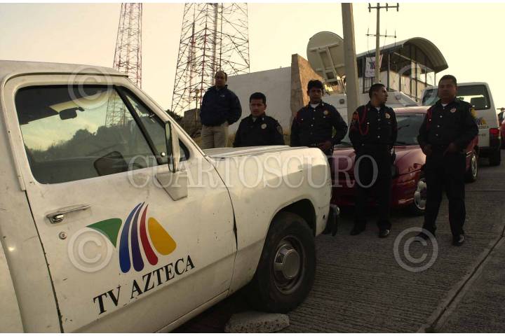Elementos de la Plicía Bancaria e Industrial resguardan las instalaciones de CNI que Televisión Azteca tomó la madrugada de ayer. FOTO: Pedro Mera/CUARTOSCURO.COM