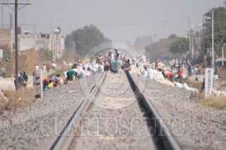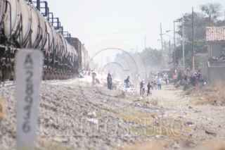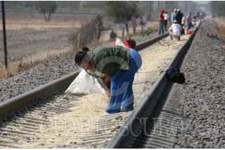 CELAYA, GUANAJUATO, 28MAYO2009.- El tren pasa sobre el maíz regado en las orillas de las vías aún se puede observar algunos costales llenos que no lograron llevarse. Este fenómeno se presentó desde el año pasado y aunque las autoridades han implementado operativos para su contención sectores de la población han denunciado que esta actividad ha contado con la beligerancia de estas, además de que habitantes de varias colonias como la de Santa Teresita han encontrado en esta acción delictiva una manera de sobrevivir ante la gran crisis económica que se vive en el país. FOTO: ARCHIVO/ANTONIO GARCÍA/AM CELAYA