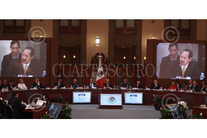 MÉXICO, D.F., 02 JUNIO2009.- Fernado Gomez Mont Secretario de Gobernación acompañado por Felipe Calderón Hinojosa Presidente de México saluda a Guillermo Galvan Galvan Secretario de la SEDENA durante la XXVI sesión del Consejo Nacional de Seguridad Pública en Palacio Nacional encabezada por el mandatario mexicano FOTO: SÁSHENKA GUTIÉRREZ/CUARTOSCURO.COM