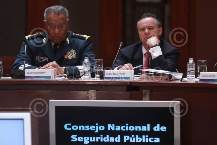 MÉXICO, D.F., 02JUNIO2009.- Felipe Calderon Hinojosa, Presidente de México, conversa con Jorge Tello Peón, Secretario Ejecutivo del sistema Nacional de Seguridad Pública, mientras Guillermo Galvan Galvan, titular de la SEDENA observa la XXVI sesión del Consejo Nacional de Seguridad Pública en Palacio Nacional, encabezada por el mandatario Mexicano. FOTO: SÁSHENKA GUTIÉRREZ/CUARTOSCURO.COM